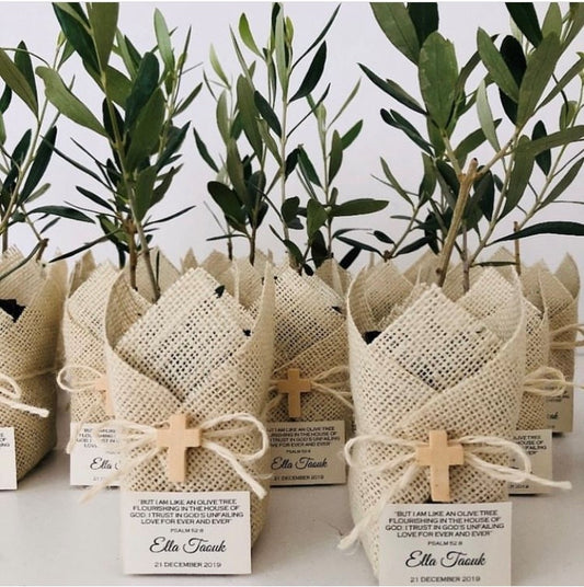 Olive Plant w/ Ivory Cross & Jute Bomboniere