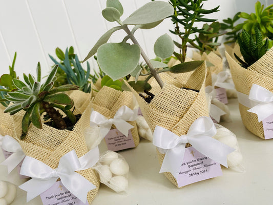 Succulent Plant w/ Brown Cross & Jute Bomboniere