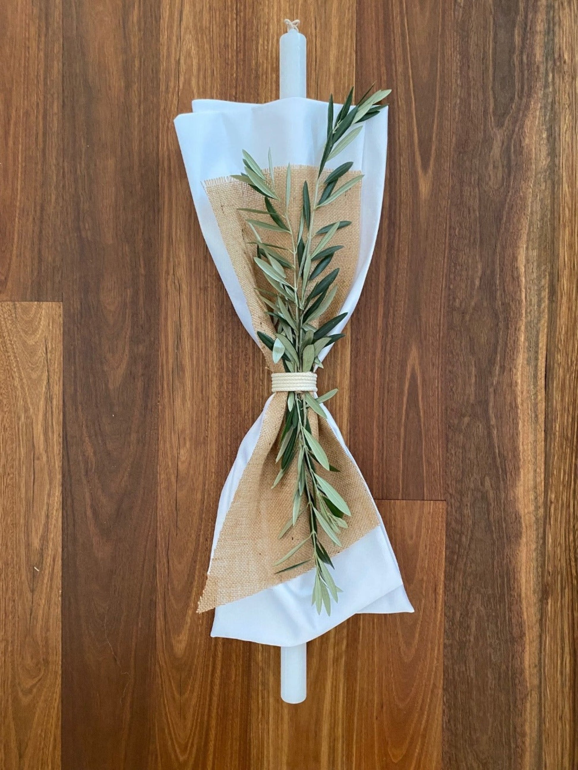 - Handmade Christening Candle - Elegantly dressed with fresh olive branches and natural materials including; Natural Rope, Brown Hessian, White Satin Fabric