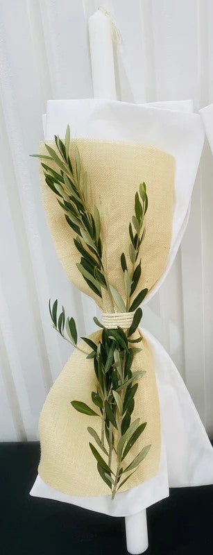 - Handmade Christening Candle - Elegantly dressed with fresh olive branches and natural materials including; Natural Rope, Ivory Hessian, White Satin Fabric