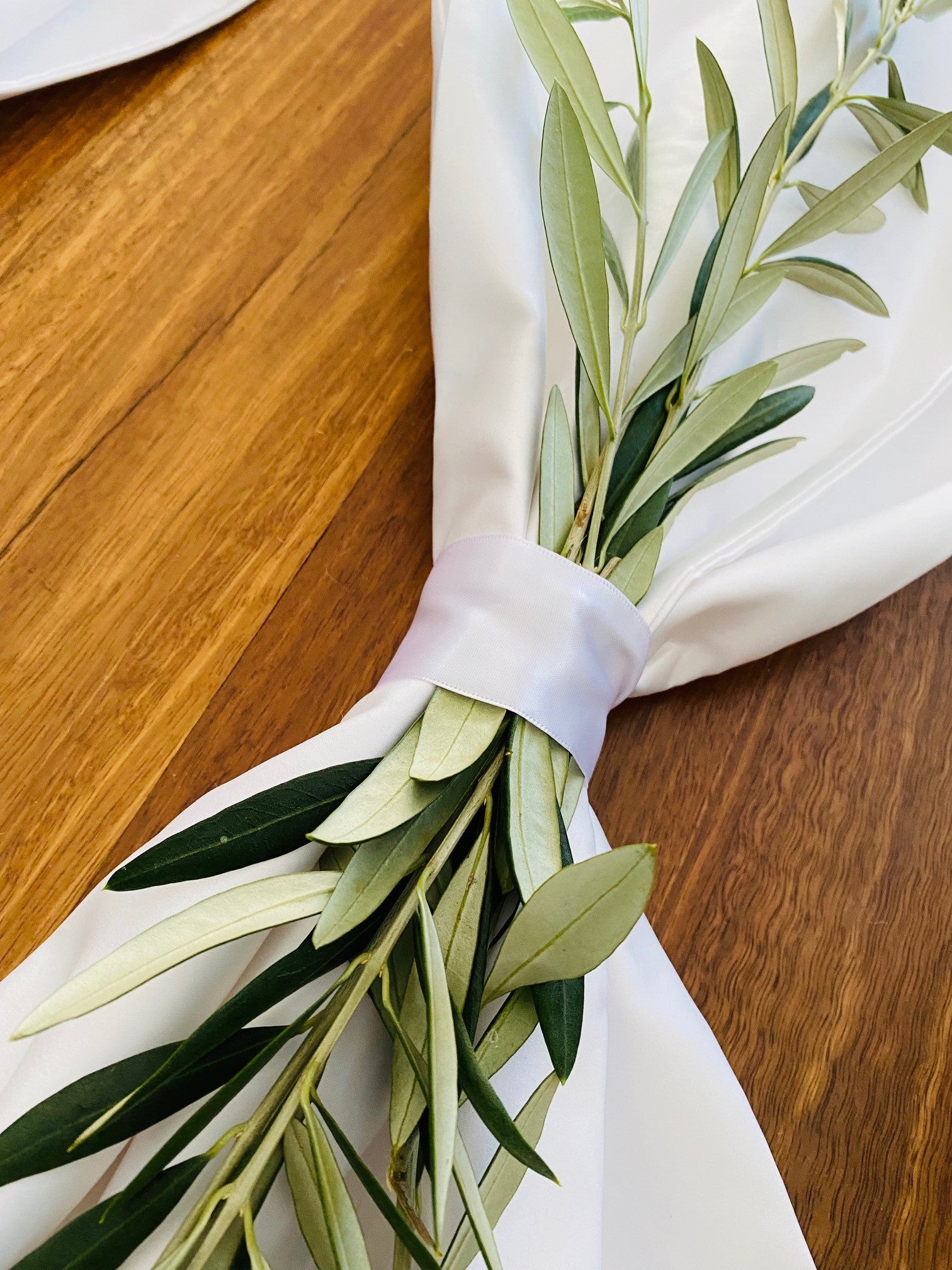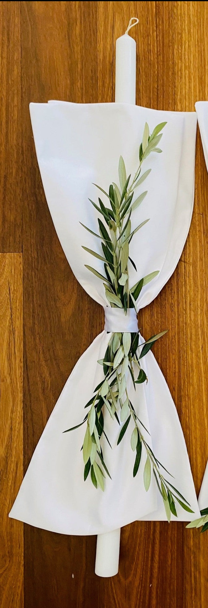 - Handmade Christening Candle - Elegantly dressed with fresh olive branches and natural materials including; White Satin Ribbon and White Satin Fabric