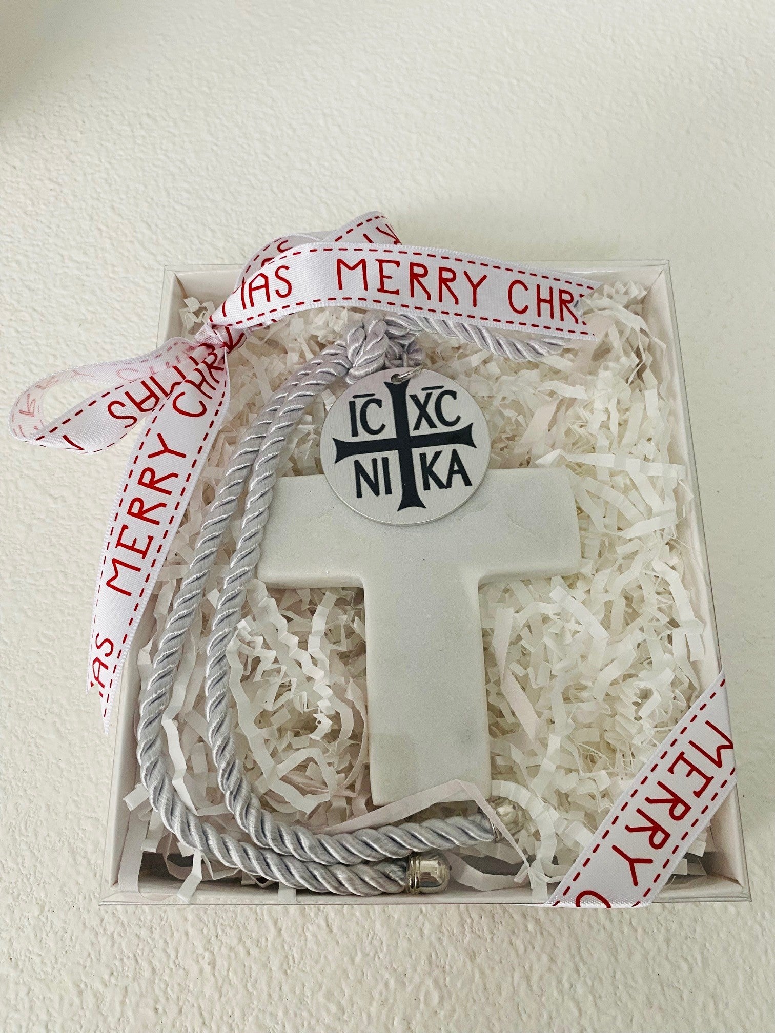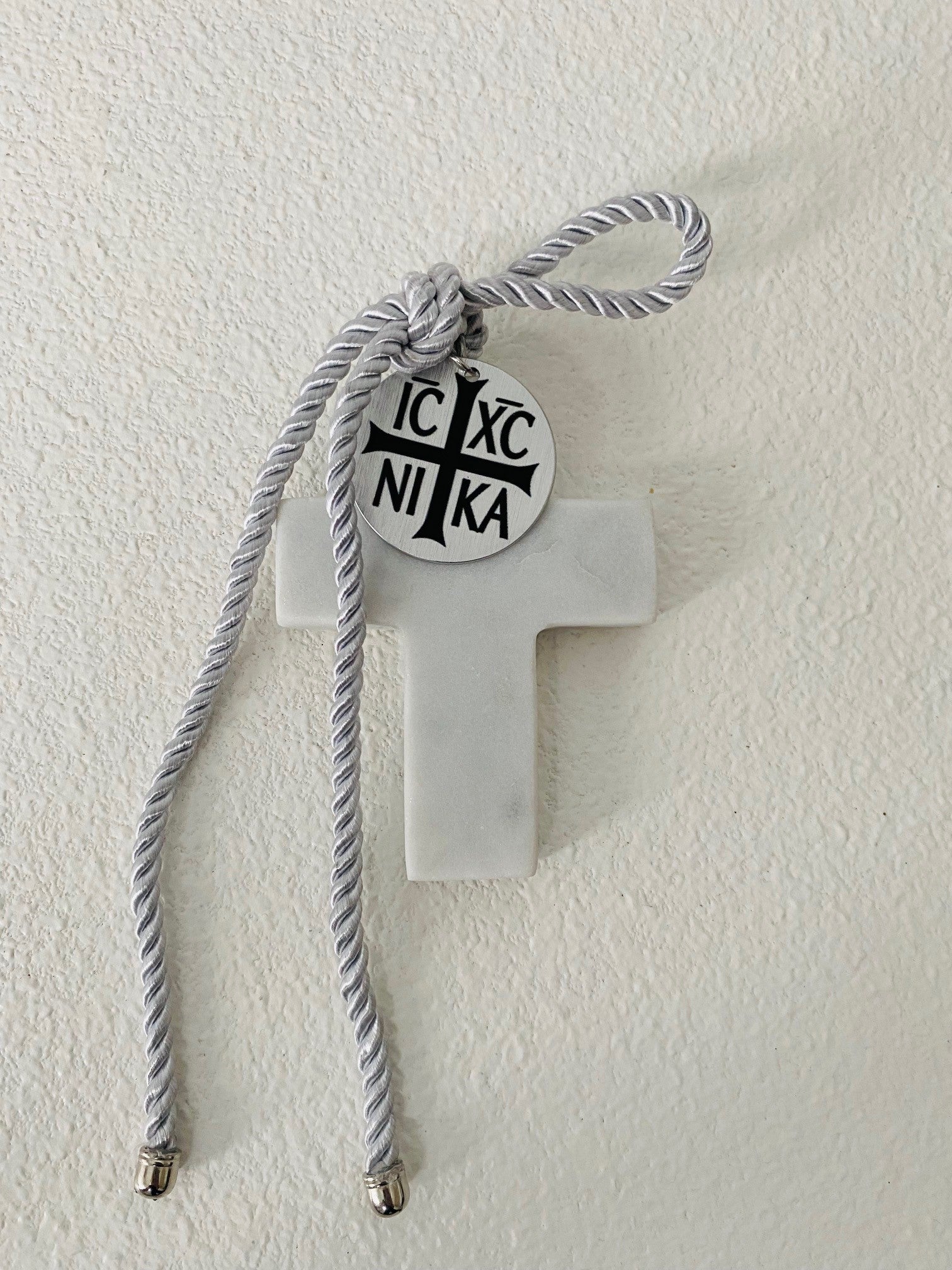 Marble Cross: Our marble cross is a beautiful piece for your home or as a gift. A symbol of faith, love and hope. Embellished with IC XC NIKIA large silver charm and braided silver silk rope.