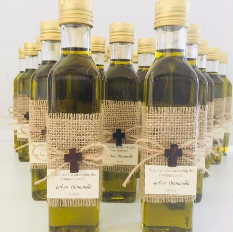 Olive Oil Bottle 250mL w/ Jute & Brown Cross Bomboniere