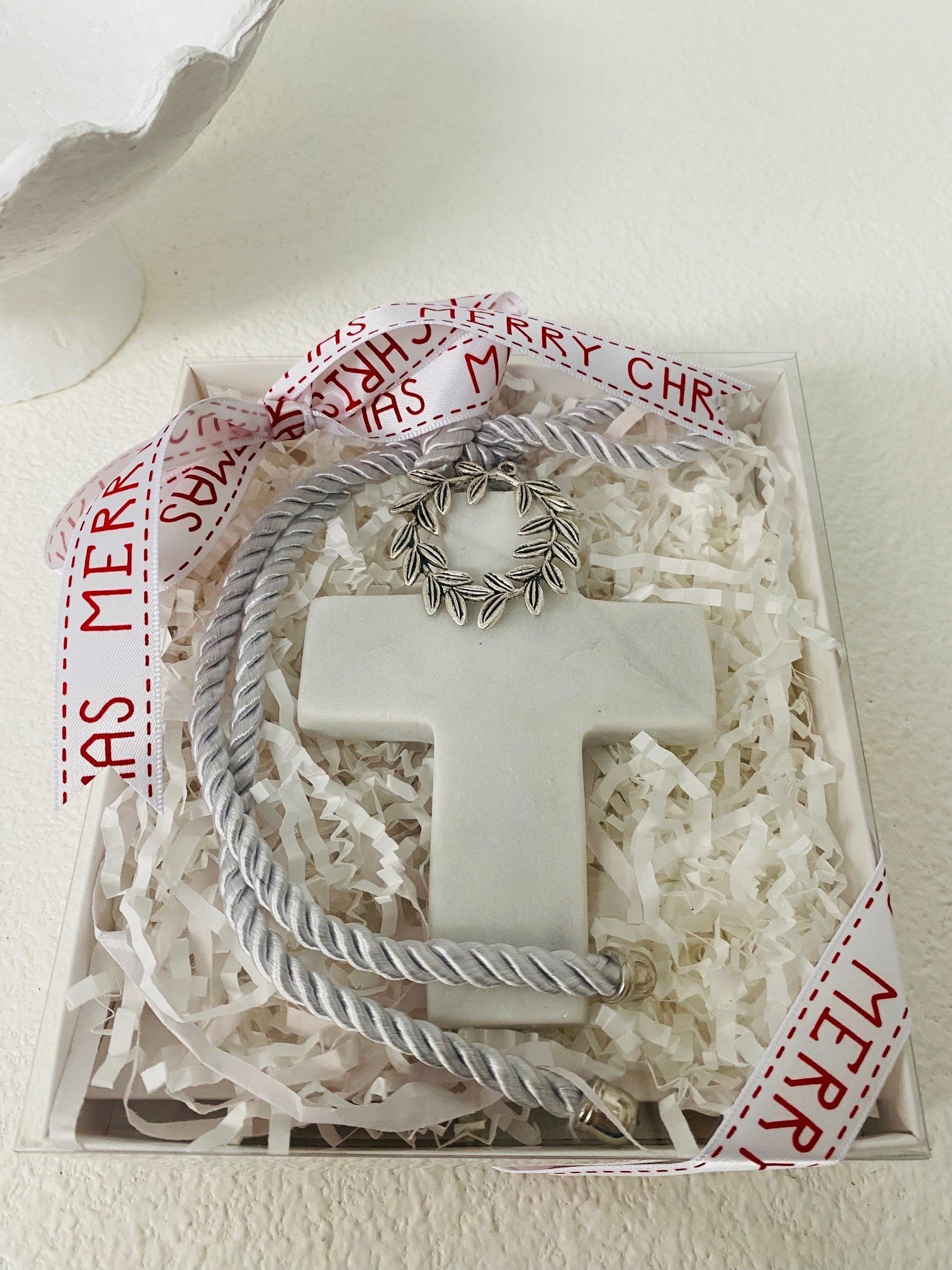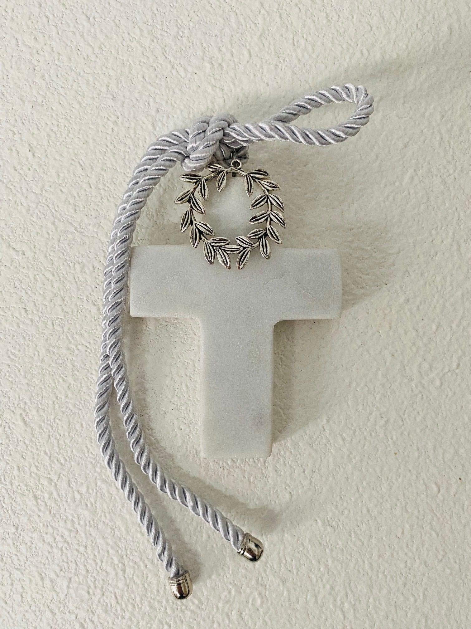 Marble Cross: Our marble cross is a beautiful piece for your home or as a gift. A symbol of faith, love and hope. Embellished with olive wreath silver charm and braided silver silk rope.