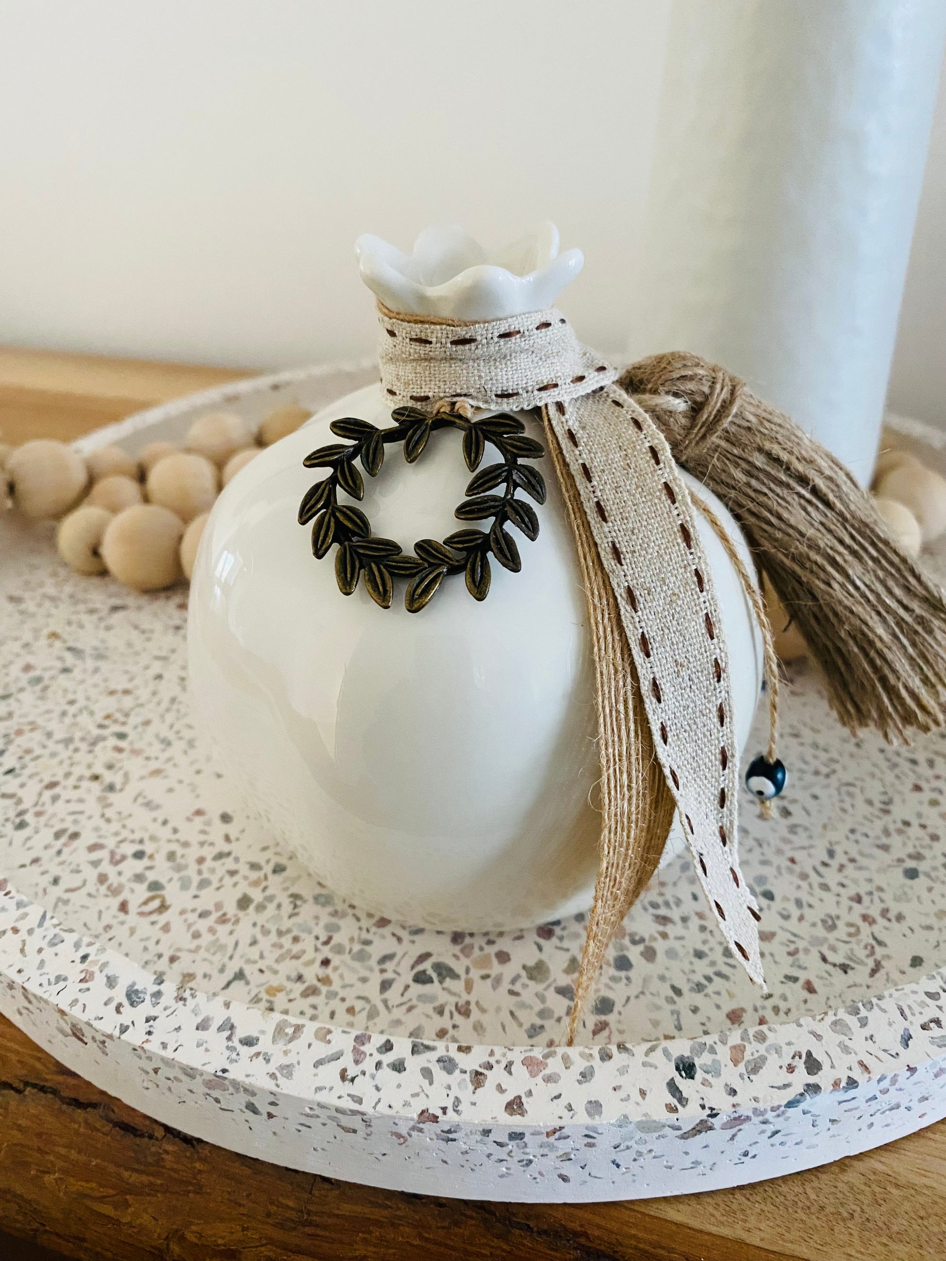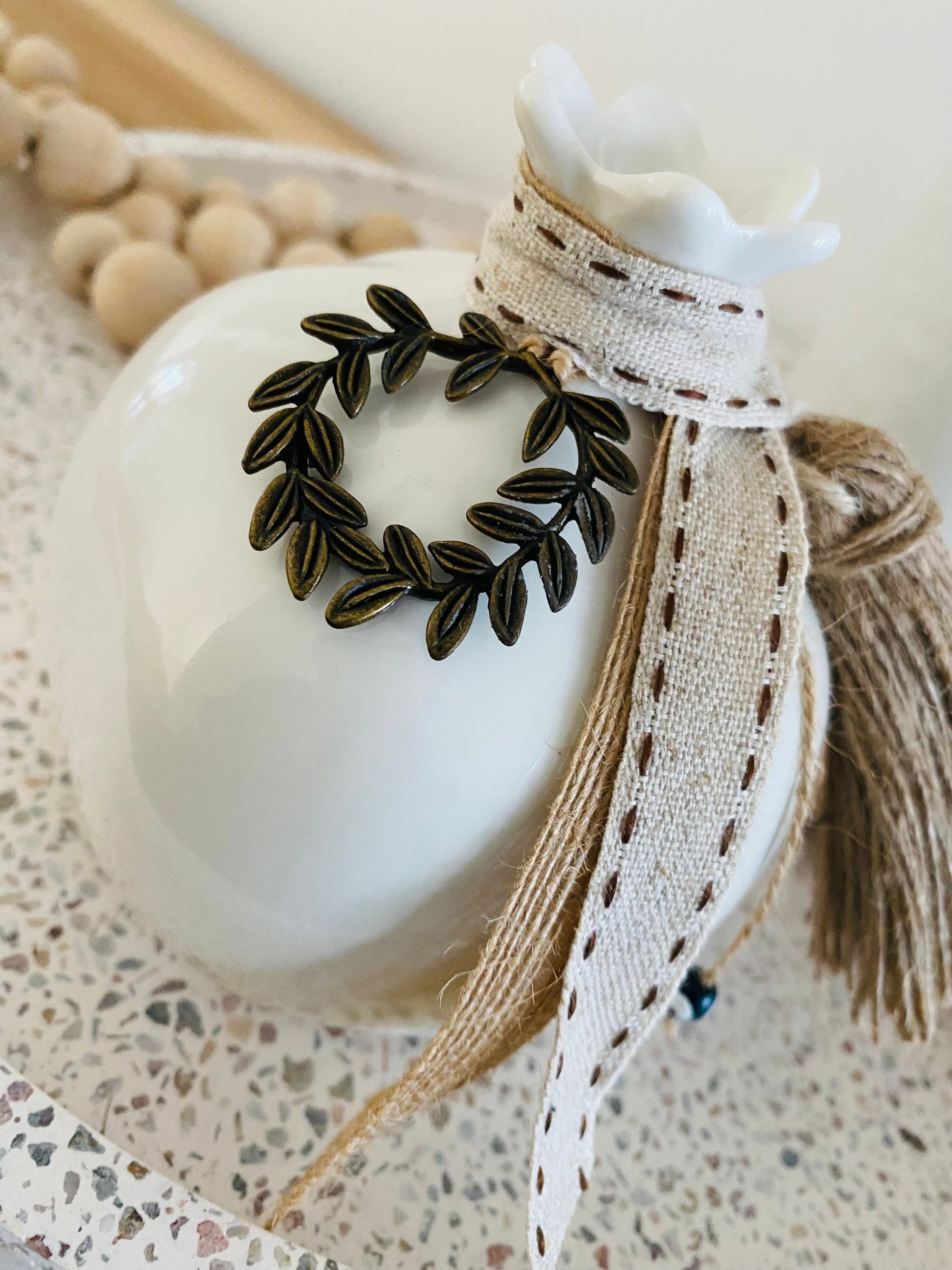 These are all handmade, one of a kind, beautifully styled with a brass olive wreath and combination of natural ribbons and tassel.
