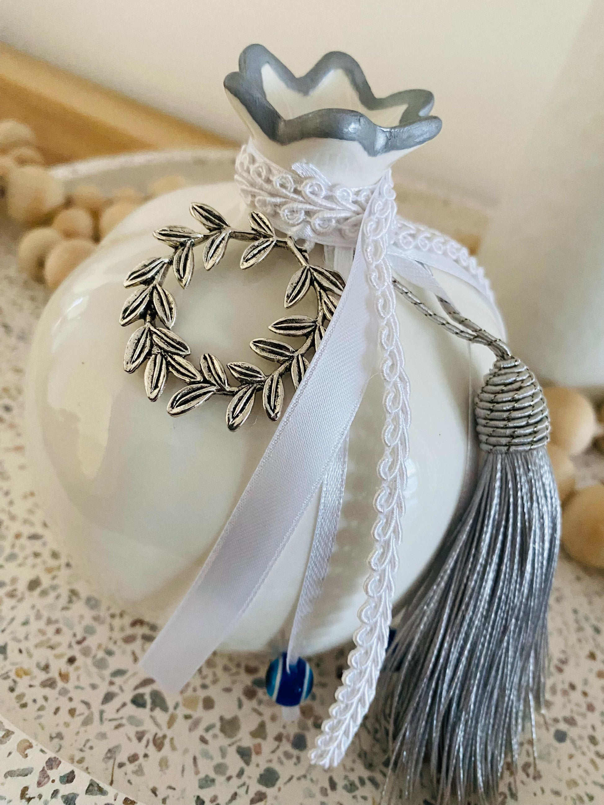 These are all handmade, one of a kind, beautifully styled with a silver olive wreath and combination of white ribbons, silver tassel and evil eye beads.