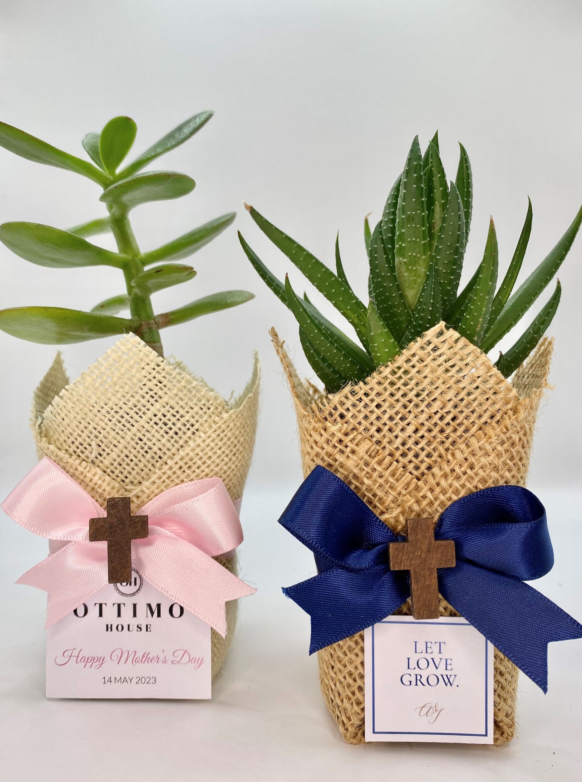 Succulent Plant w/ Brown Cross & Ribbon Bomboniere