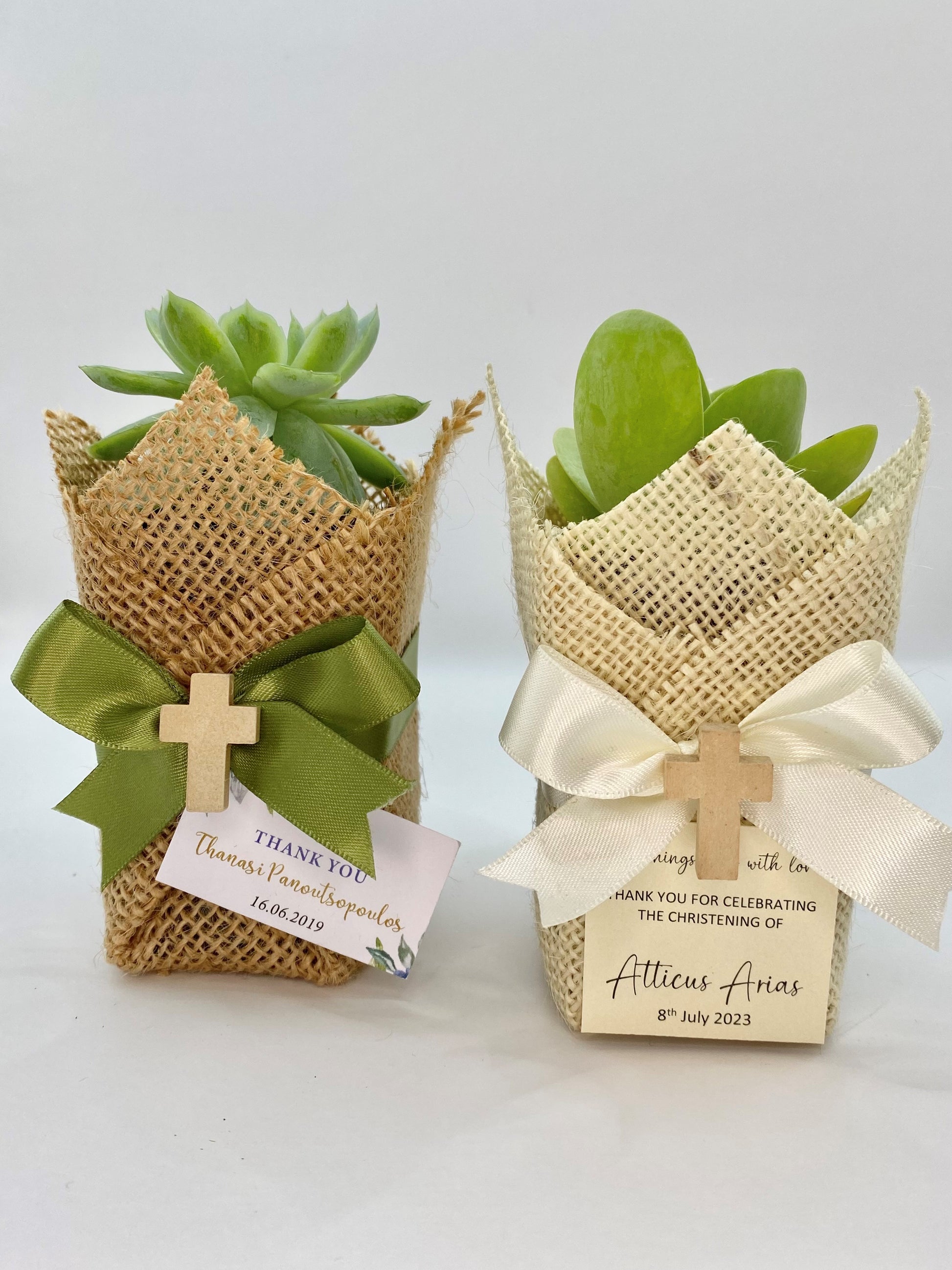 Succulent Plant w/ Ivory Cross & Ribbon Bomboniere