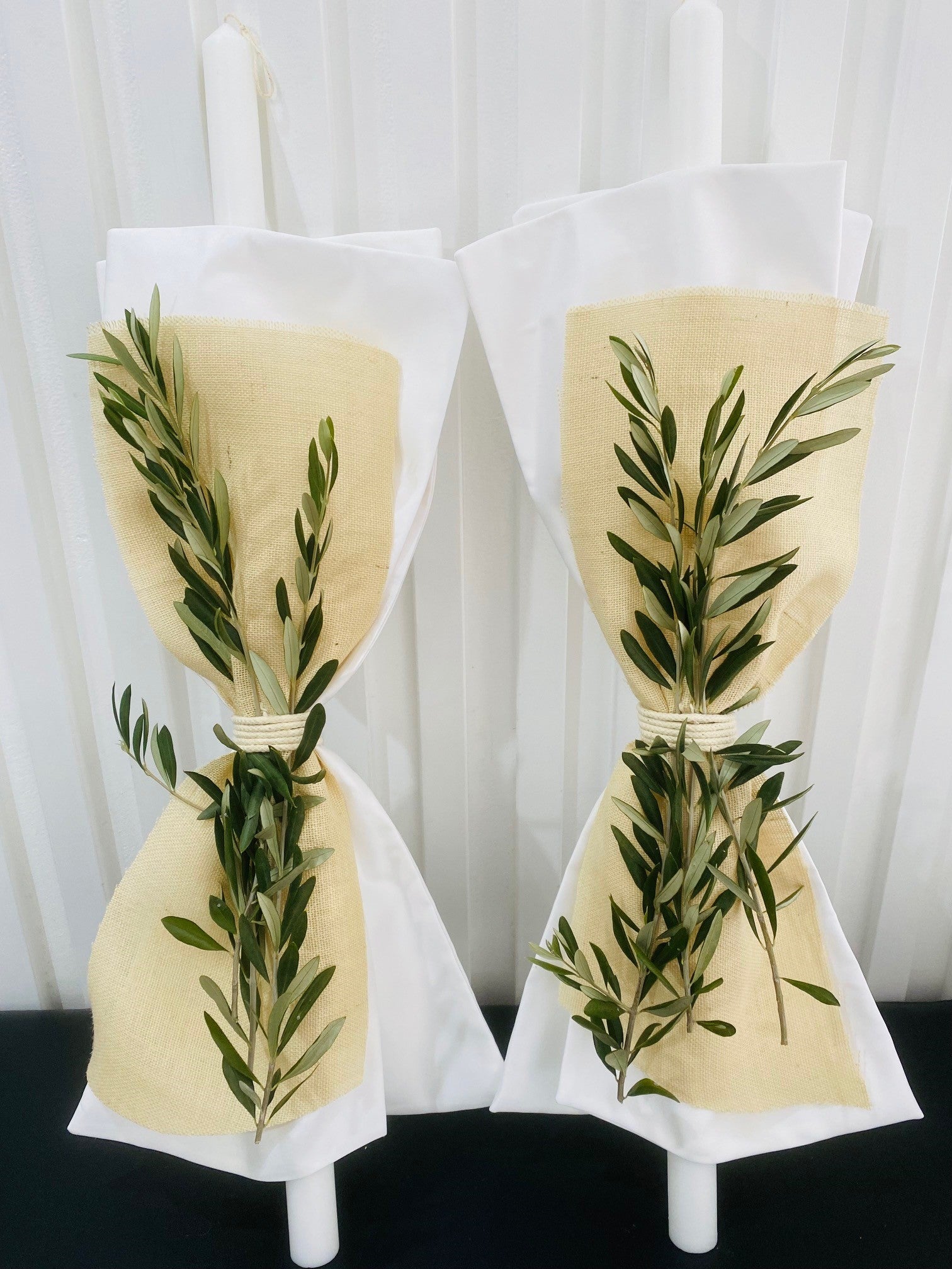 - Handmade Wedding Candles - Elegantly dressed with fresh olive branches and natural materials including; Natural Rope, Ivory Hessian, White Satin Fabric